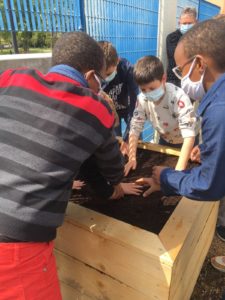 Lundi 3 mai après-midi, le groupe de 5éme C a rempli le troisième bac avec le compost et la paille puis préparé les deux premiers à recevoir les premières plantations des 6e A.